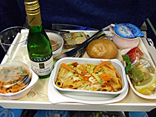帰り最初の機内食のパスタ。ペンネのホワイトソース。ワインは白ワイン「チャンカヤ」。 |