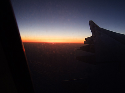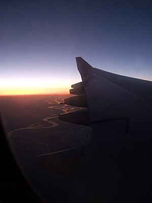 しばらくして8時すぎに機内は暗くなった。飛行機はカザフスタンあたりの上空を飛んでいるらしく、夕焼けの大地がはっきりと窓から確認でき、何もないところに沈む太陽が大変美しい。途中激しく蛇行する河が見えてきて、果てしなく続く大地に消えていくのが感動した。