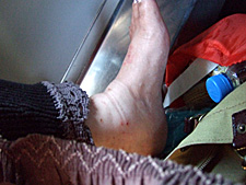 飛行機の中で撮った足。エコノミー症候群でむくみと湿疹がひどい。 |